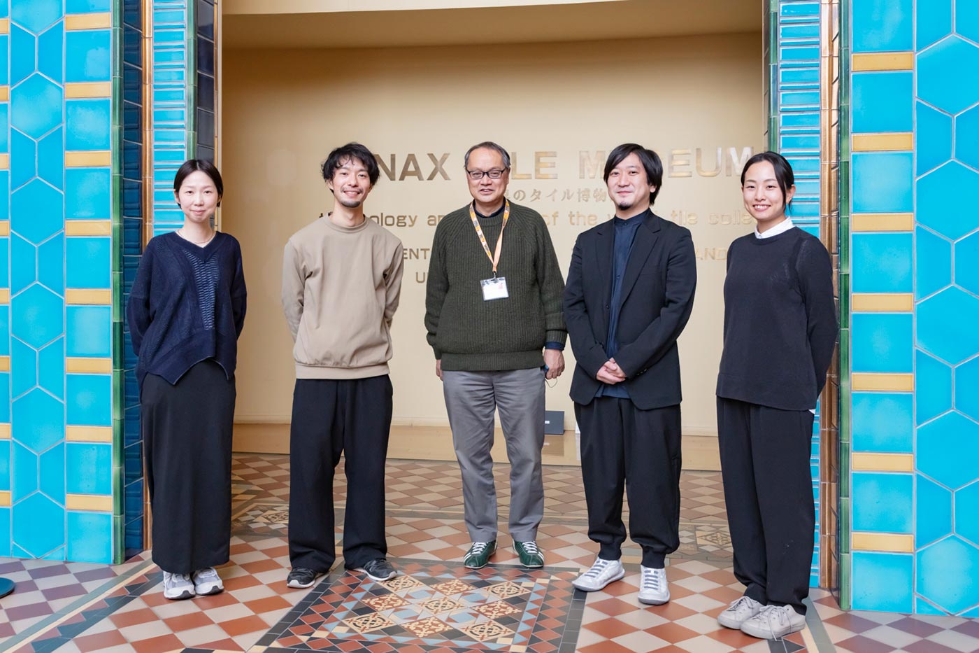 INAXライブミュージアム「世界のタイル博物館」を訪れたツバメアーキテクツの4人。左から西川日満里さん、千葉元生さん、ミュージアムの主任学芸員・後藤泰男さん、山道拓人さん、鈴木志乃舞さん。