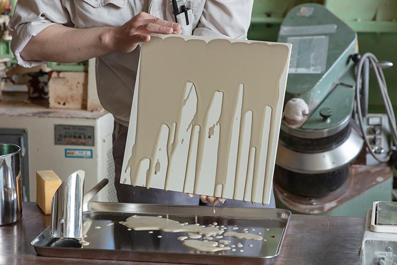 ここで、芦澤さんに「みたらしタイル」のつくり方を解説してもらう。みたらしタイルの基本の化粧材料は「泥」。外装用タイルの粘土原料を水で流動状に溶いたものだ。化粧手法は「流し掛け」と「ディップ」の2つで、両方とも手作業で一枚一枚施釉する。「けっこうむずかしいんです。どんな道具を使ったらいいか、どんな手順がいい表情を出せるのか、ツバメアーキテクツの皆さんと考えながら、試しながら考えていきました」。現われる表情がすべて違ってくる。その違いがツバメの目指す偶然性のおもしろさになる。